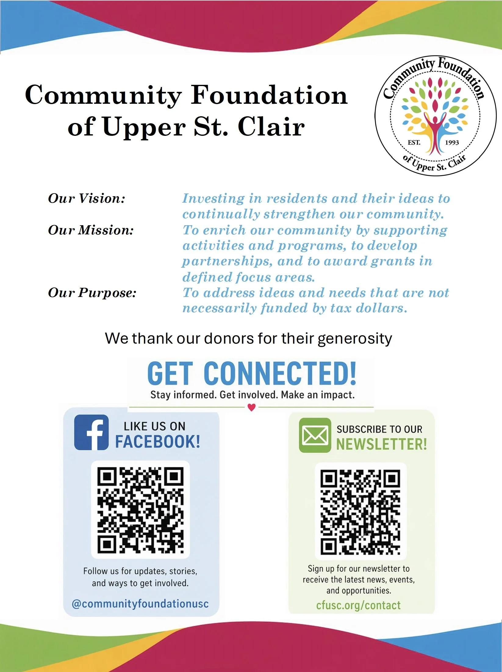 Organized by residents concerned about the future of our community, the Community Foundation of Upper St. Clair is one of a growing number of municipal foundations across the United States.