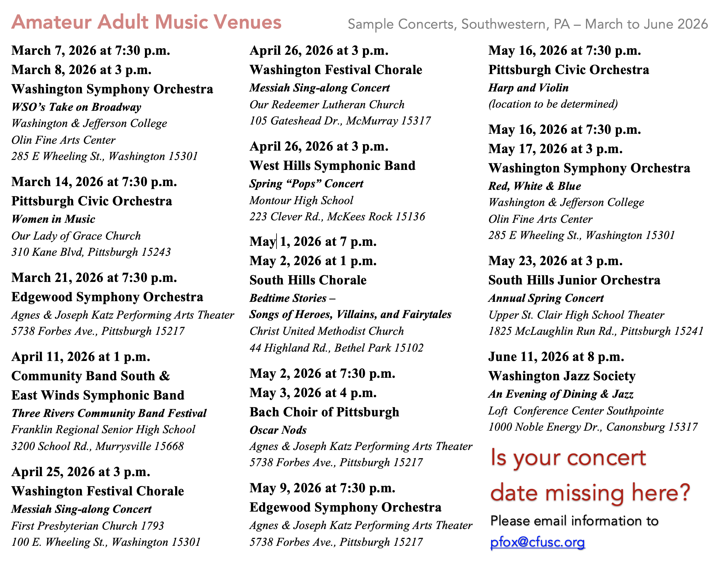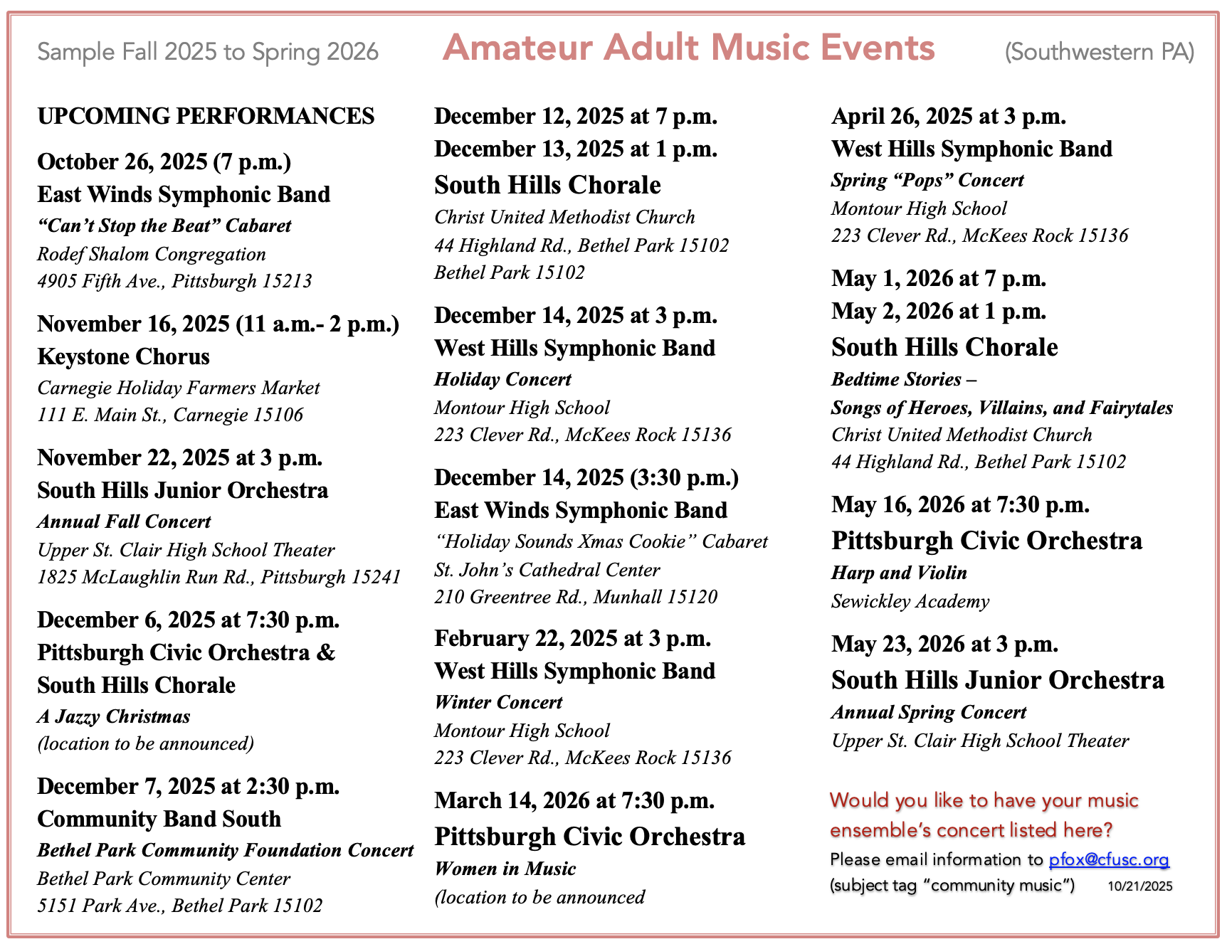 How about a Southwestern, PA Calendar of Sample Adult Amateur Music Events?