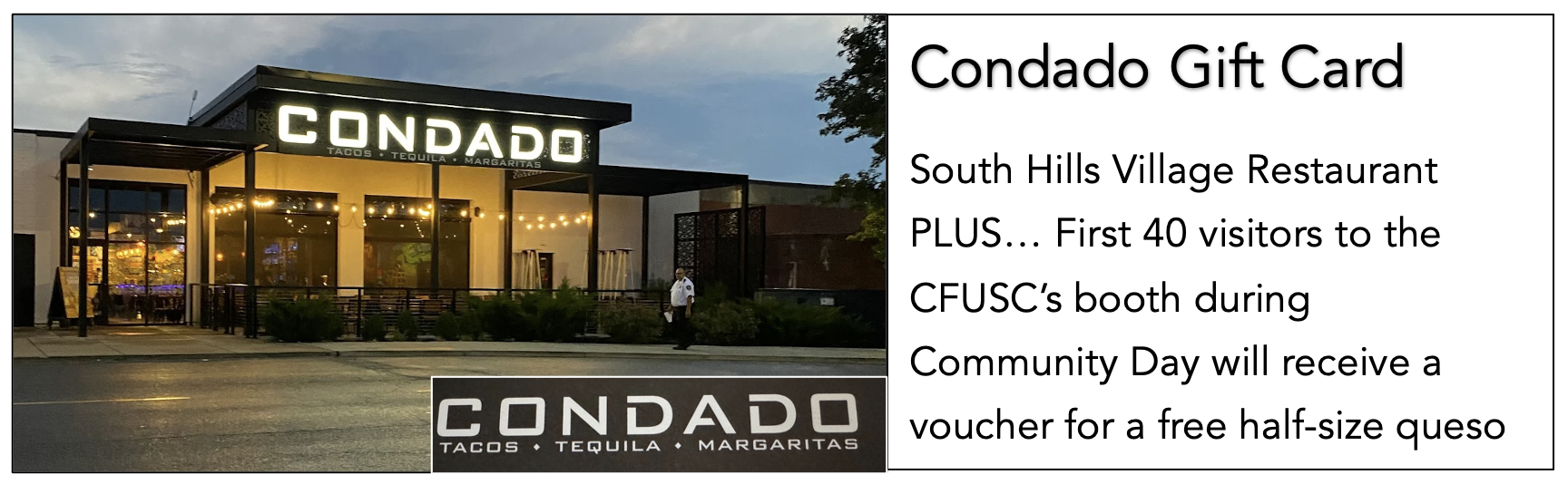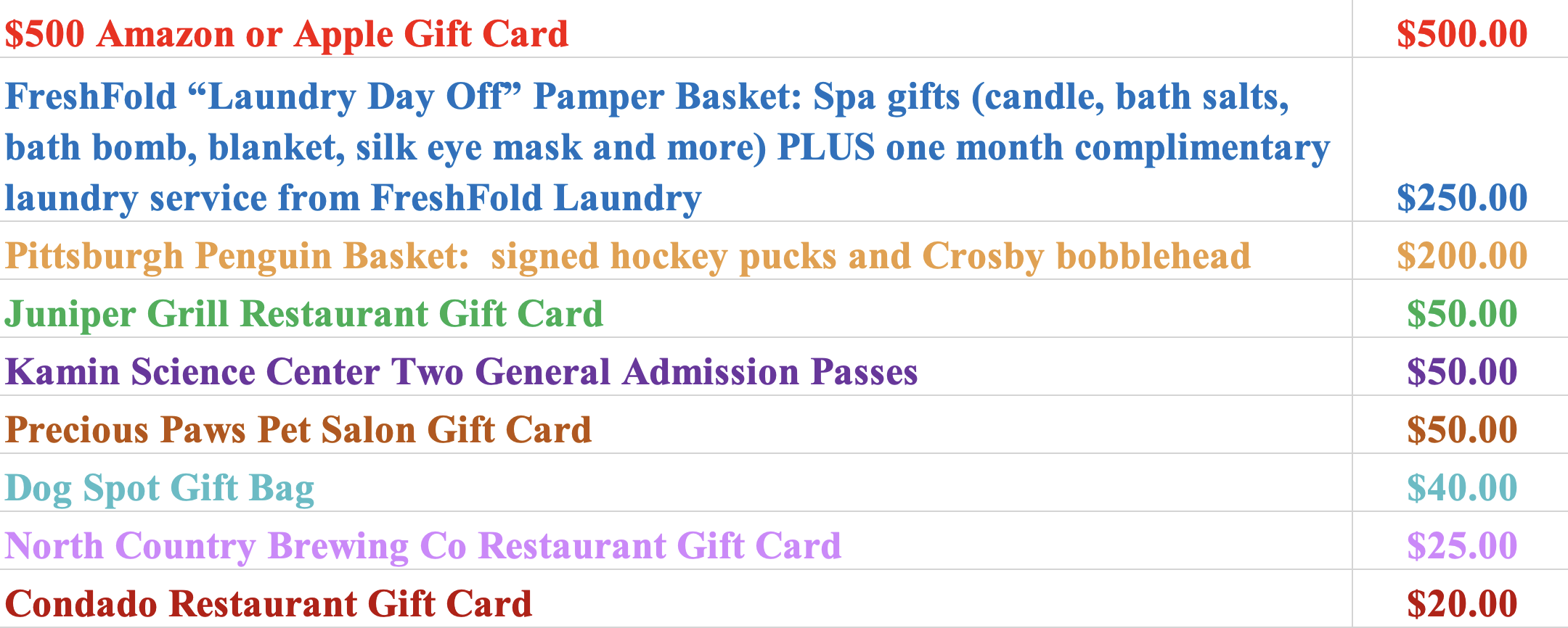 More awards are on the way: restaurant and store gift cards, pet care, food, treats or supplies, photography, professional services, Pirate baseball cards, tickets for local sports or arts events, yoga classes, etc. AND SO MUCH MORE! The CFUSC trustees are currently “out and about” looking for more donations! All proceeds help fund the programs of your local charity - CFUSC.