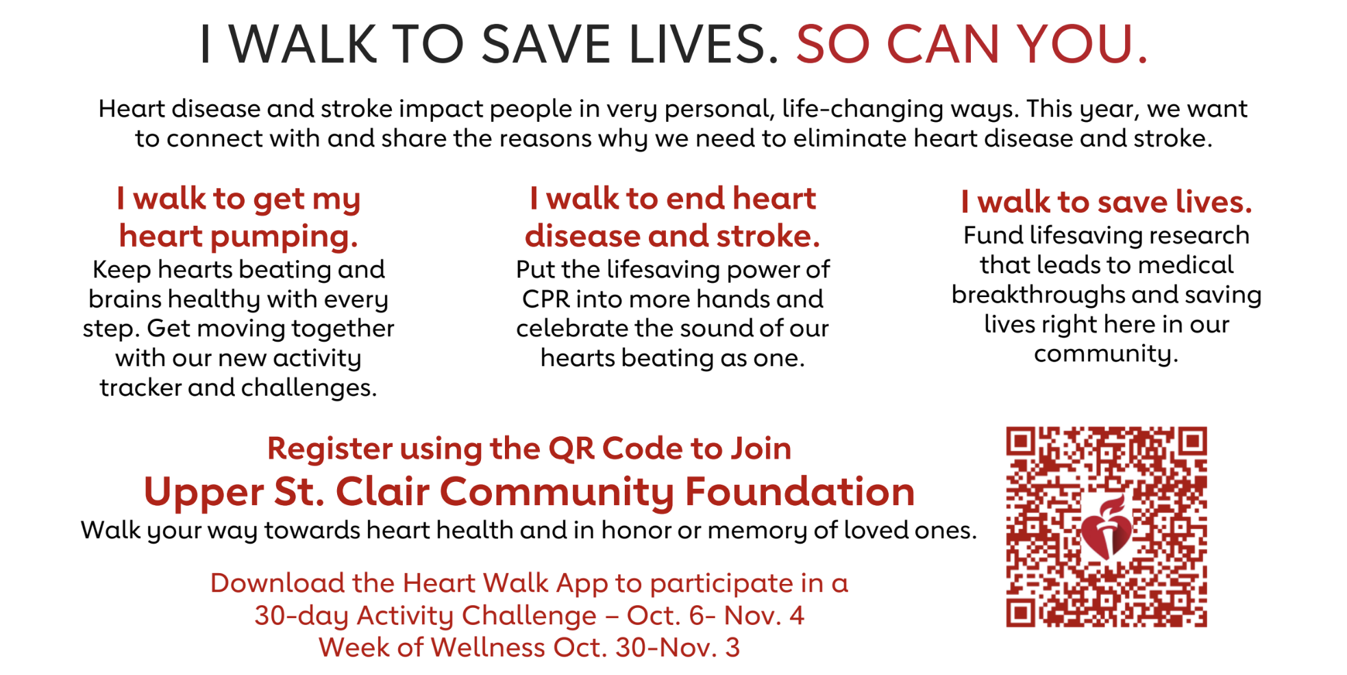 Sign-up to participate in the American Heart Association Pittsburgh 2023 Heart Walk and join the “Upper St. Clair Community Foundation” team (or search under team captain for “Carla Higgins”).